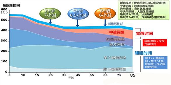 NREM期均從1期開始,1期為1~7分鐘,占總總睡眠的2~5%,這個時期易驚醒;2期持續(xù)10~25分鐘,每個循環(huán)逐漸延長,占總睡眠的45~55%,驚醒需要很大的刺激;3、4期兩期睡眠常合稱為慢波睡眠(sws)δ睡眠或者深睡眠,慢波活動占據(jù)50%以上,需要更大的刺激才能導致覺醒。 2,3,4期NREM期睡眠與主觀睡眠質(zhì)量有關,也就是人們常說的昨晚睡得好不好。同時2,3,4期NREM期睡眠和REM期是記憶力鞏固的重要階段。 隨著年齡的增長,慢波睡眠逐漸減少,睡眠潛伏期時間延長。這也就是俗話“三十年前睡不醒,三十年后睡不著”的來源。 |