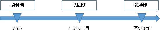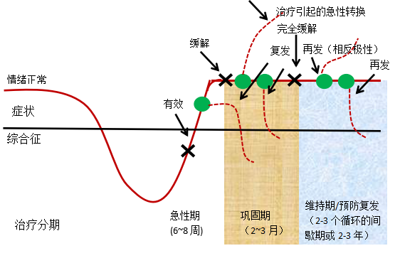 由于雙相障礙幾乎終生以循環(huán)方式反復(fù)發(fā)作,其治療目標(biāo)除緩解急性期癥狀外,還應(yīng)堅(jiān)持全病程治療原則以阻斷反復(fù)發(fā)作。醫(yī)生應(yīng)在治療開始前告知患者和家屬全病程治療的重要性及實(shí)施辦法,爭取良好的依從性。全病程治療可分為3個治療期: